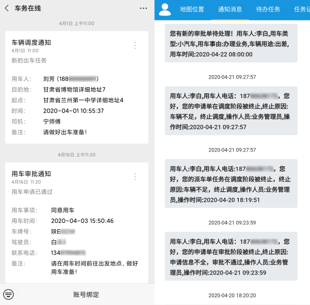 驾驶员或车辆不能正常出车时,调度人可根据实际情况进行改派,平台自动推送消息通知相关人员