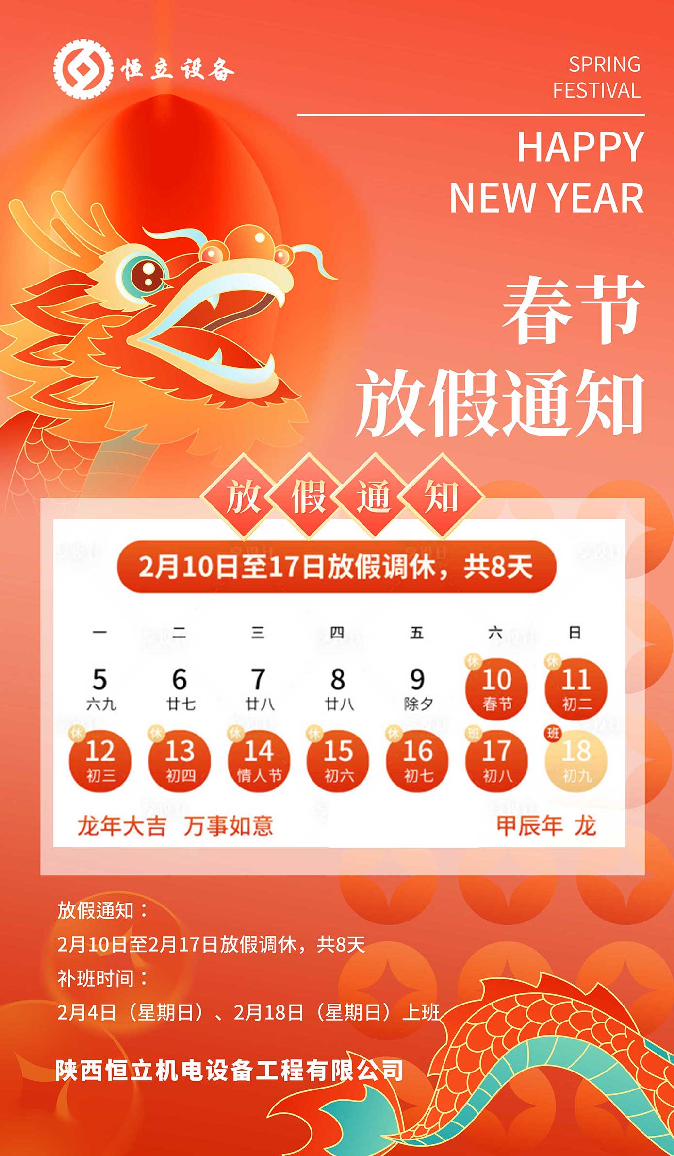 Home > 新闻动态 >公司新闻 > 恒立设备2024年春节放假通知