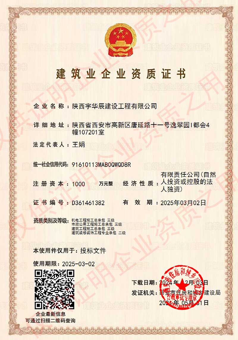 陕西宇华辰建设工程有限公司成立于2021年,注册资本金1000万元,现拥有建筑装修装饰工程专业承包贰级、机电工程总承包叁级、建筑工程总承包叁级、市政工程总承包叁级资质。